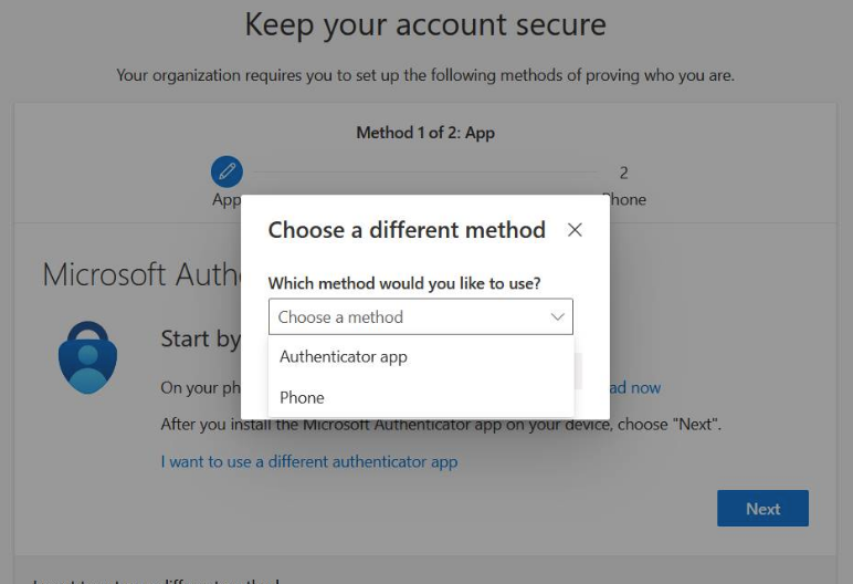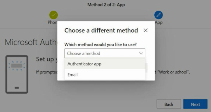 3. You will be asked to provide a second authentication method. If email is not shown, select the option to choose a different method. Select the email option from the options displayed on the dropdown list. Enter an email for your authentication method then select Next