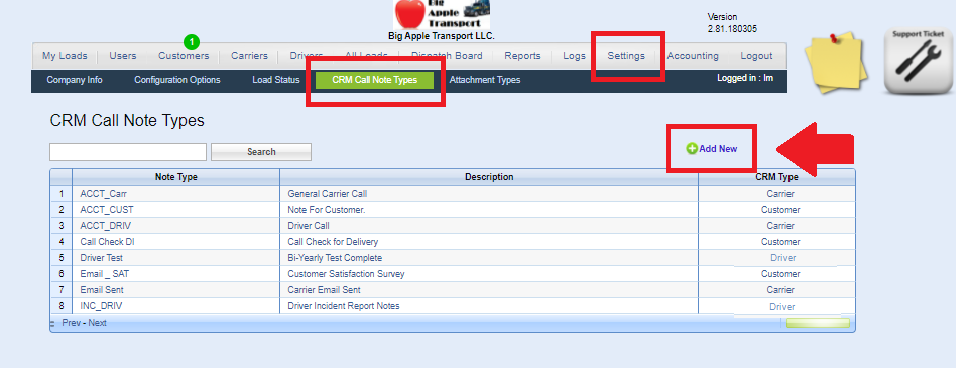 Log on to your Load Manager TMS and go to SETTINGS>> CRM CALL NOTES TYPES
