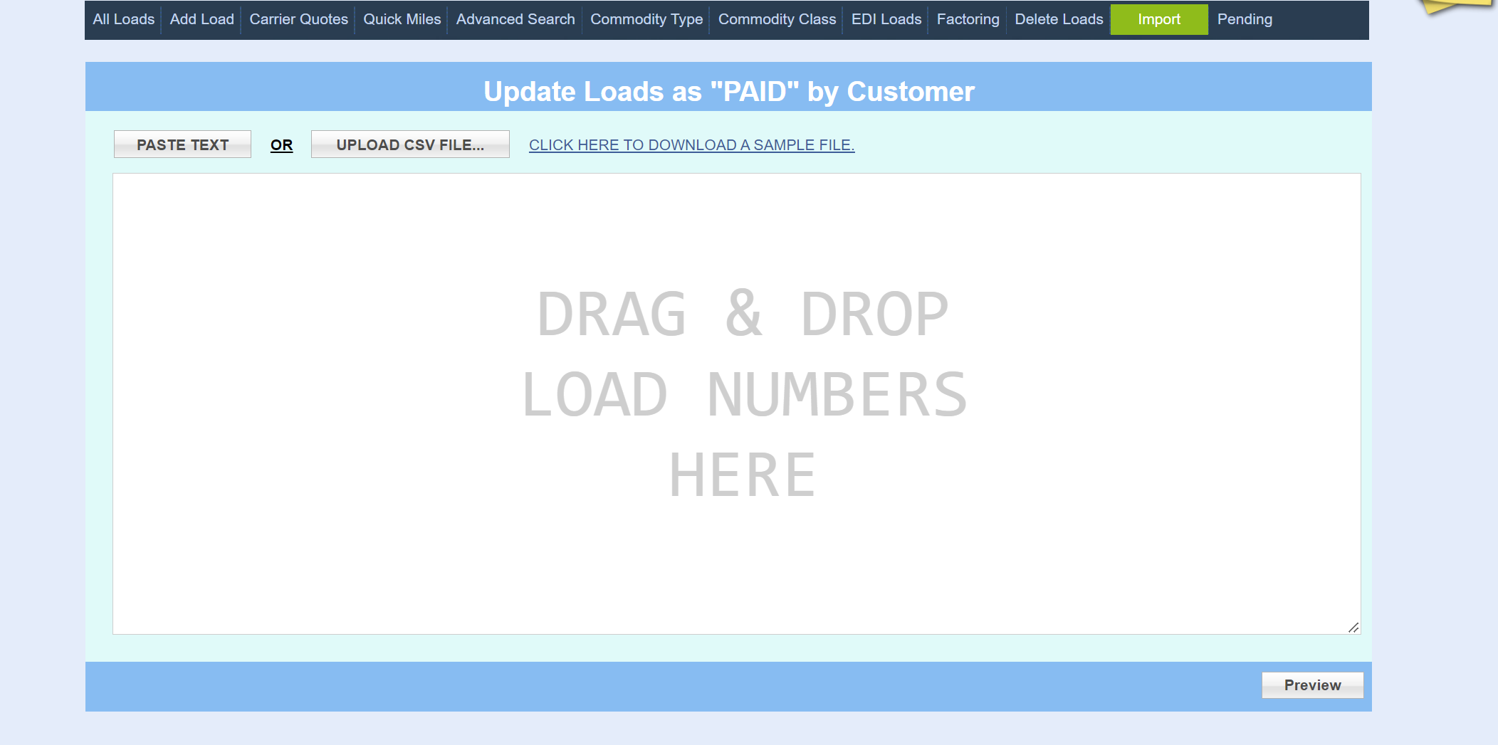 To bulk update your loads as paid by customers, go to your All Loads/My Loads tab. Click on Import then Customer Paid Loads Import