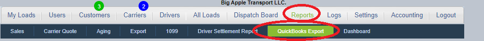 In Load Manager, Navigate to the QuickBooks submenu under the Reports tab. Choose whether you are exporting BIlls OR Invoices.