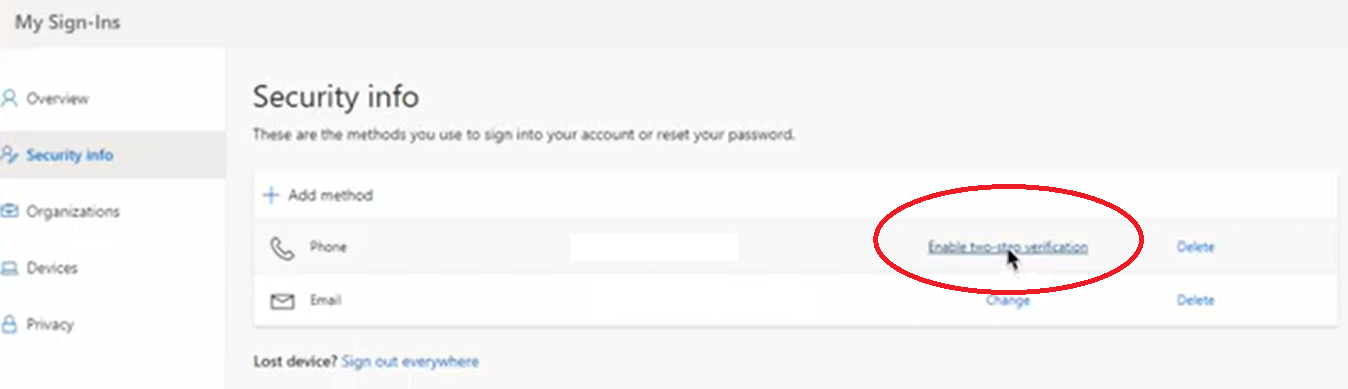 Sign Out. then Sign back in to the email account as it may take a few minutes for the Two Step Verification to update. Enter the verification code sent to your phone to prove you're authorized to access your email account if prompted. Then go to Additional security verification page,