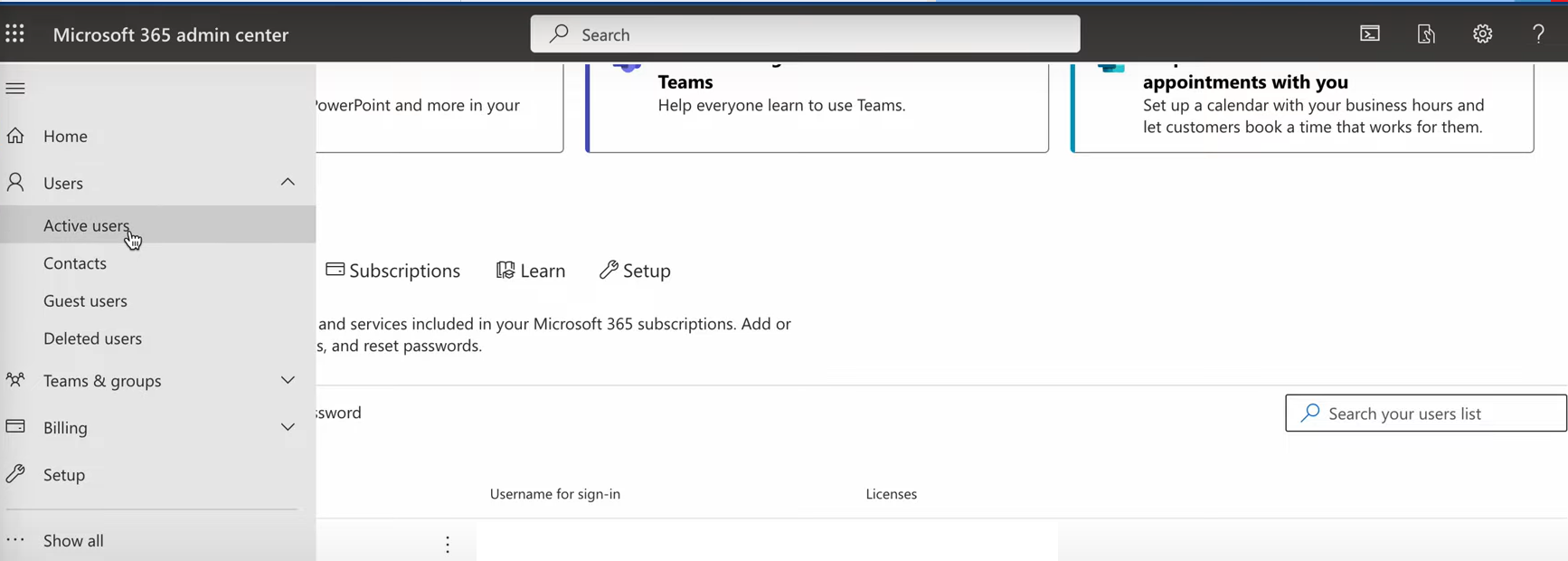 Microsoft Admin Center In menu options choose "Users', then "Active Users"